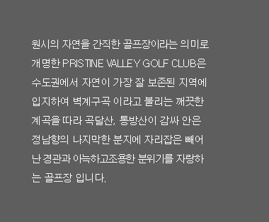 사람과 자연이 하나된 차원 높은 공간에서 과감한 도전 성공, 귀중한 휴식을 만들어 가는 신개념 골프 문화의 창조 이념을 담고 있다.